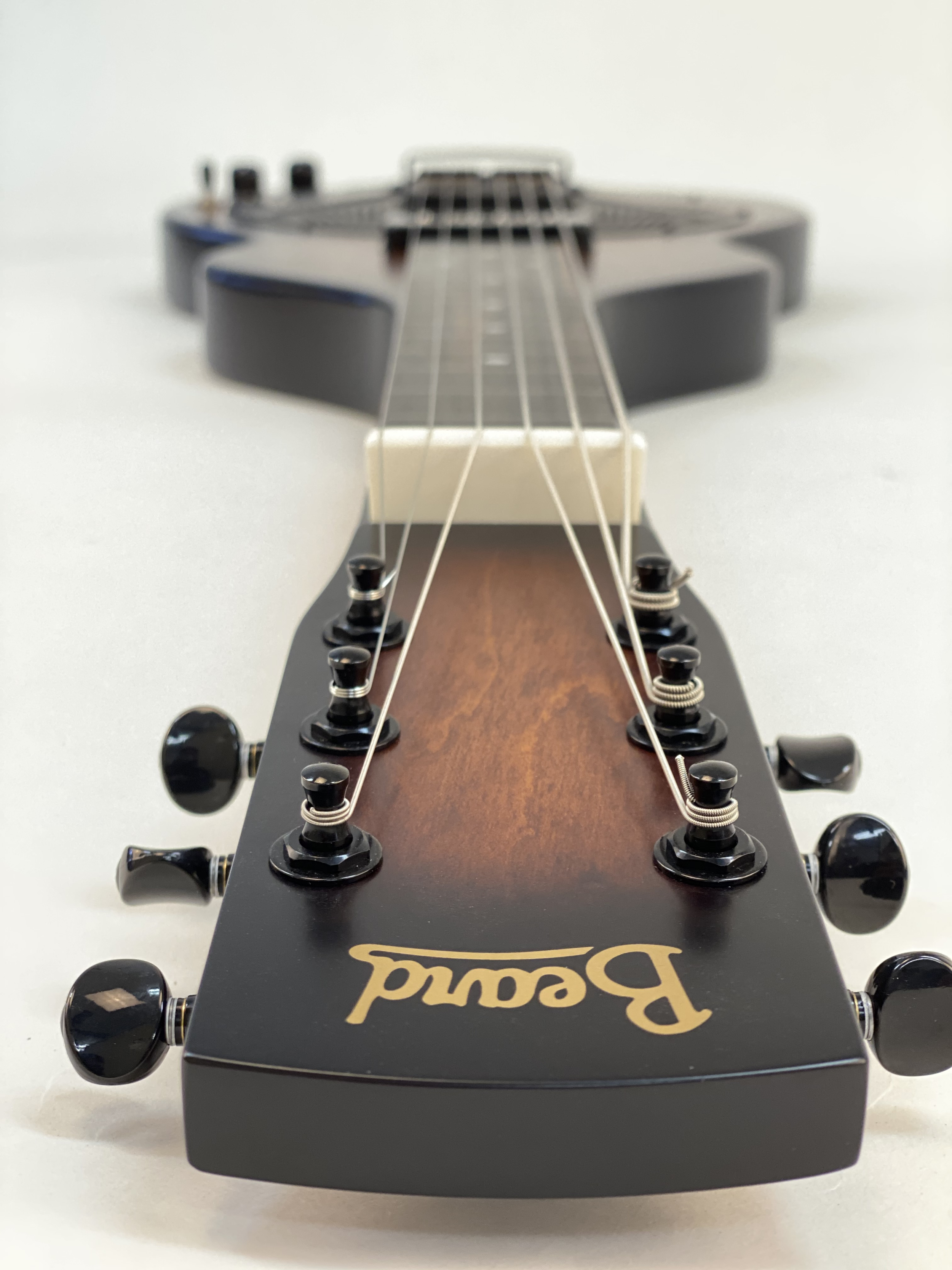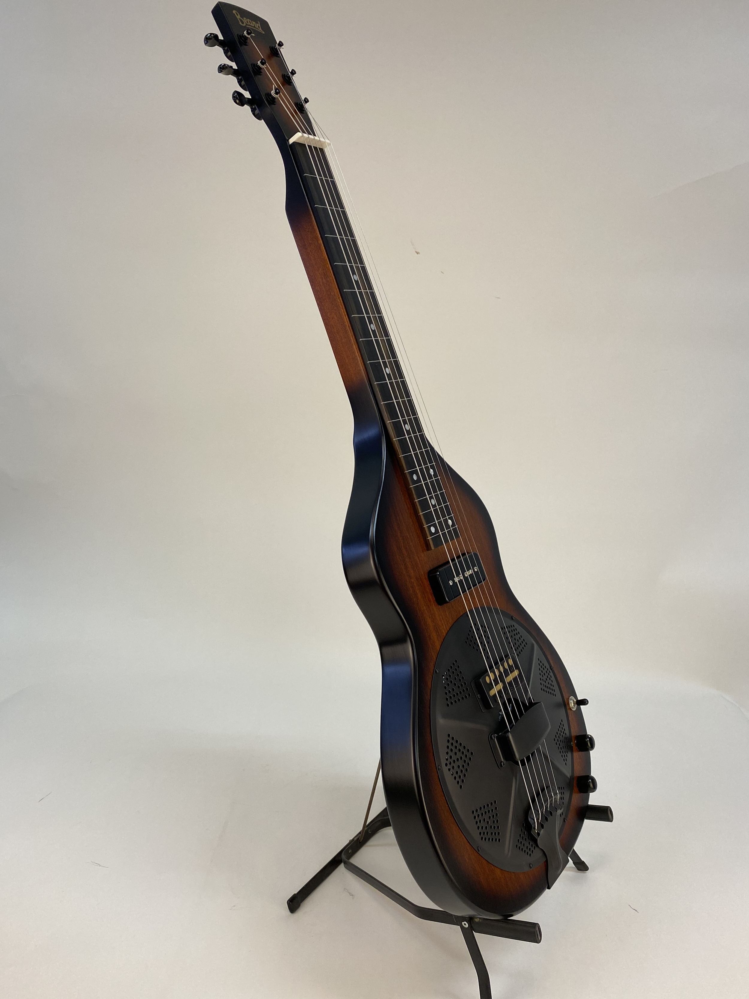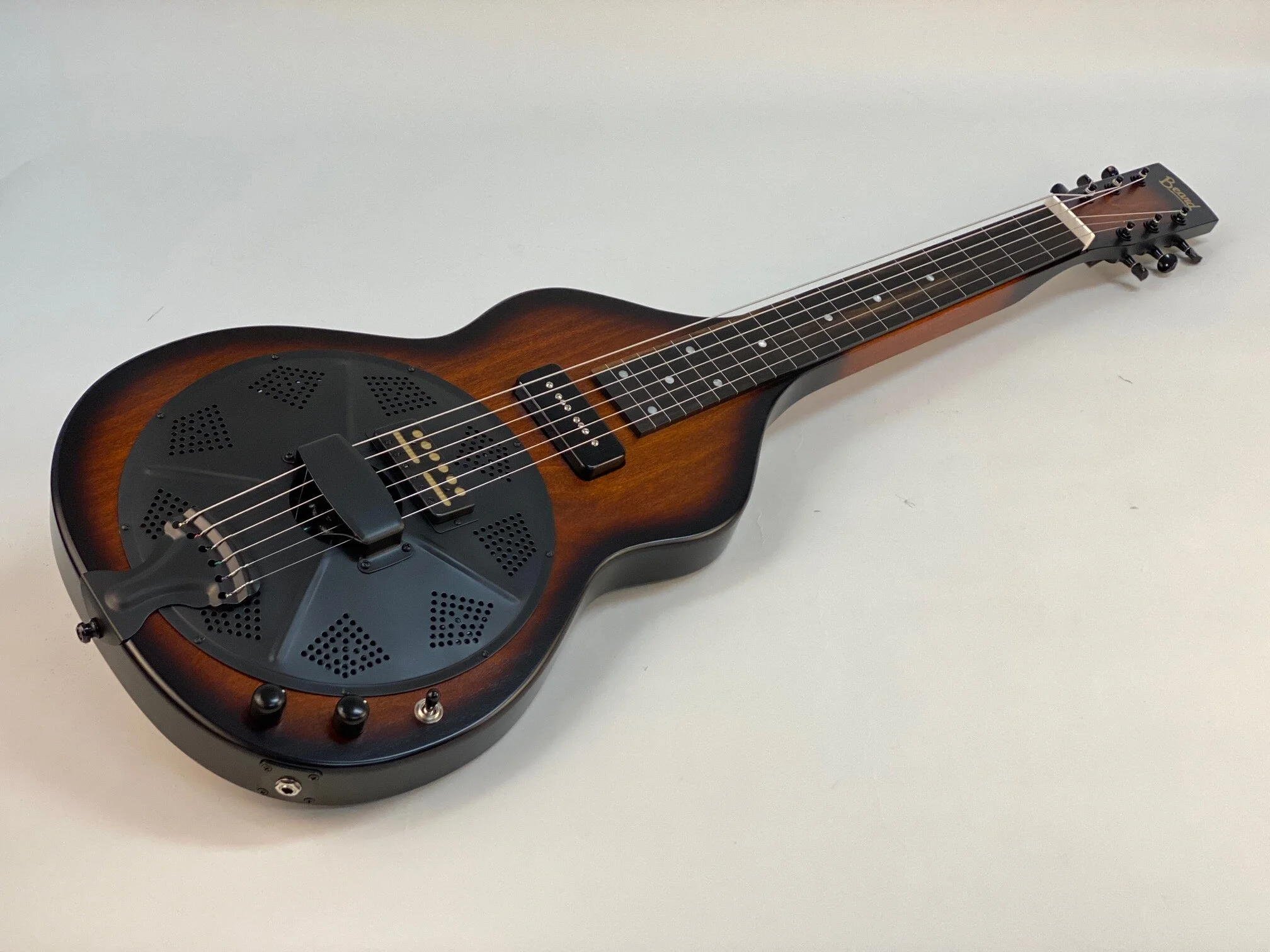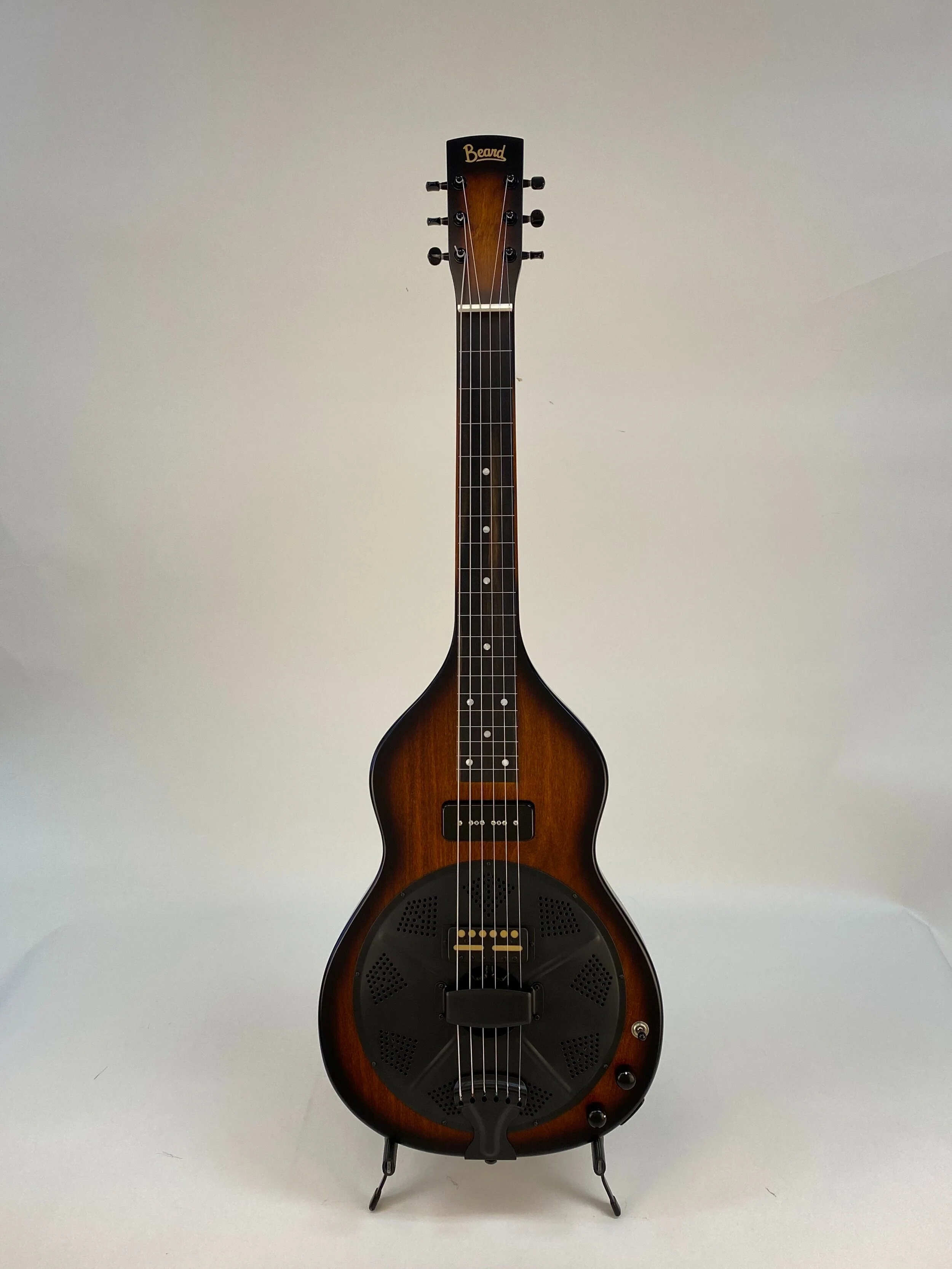 The Beard Road-O-Phonic™ is a compact acoustic/electric instrument for the musician who wants a lot of punch and versatility in a small package. With three distinct pickups, the Fishman Nashville bridge pick up, a cover plate mounted Lollar gold foil, and a Lollar P-90 in the neck position, this instrument can produce an infinite variety of sounds. The Fishman powered preamp allows you to play in a standard mono configuration or to split the Fishman bridge and magnetic pickups into stereo. This allows the player to emulate the range of sounds from a rich, mellow laptop steel guitar to a screaming bluesy resonant slide guitar or a combination of both. Solid poplar construction, dot inlay with ebony fretboard. Beard® hand spun BC-9 spider bridge resonator. Tobacco Burst satin finish.