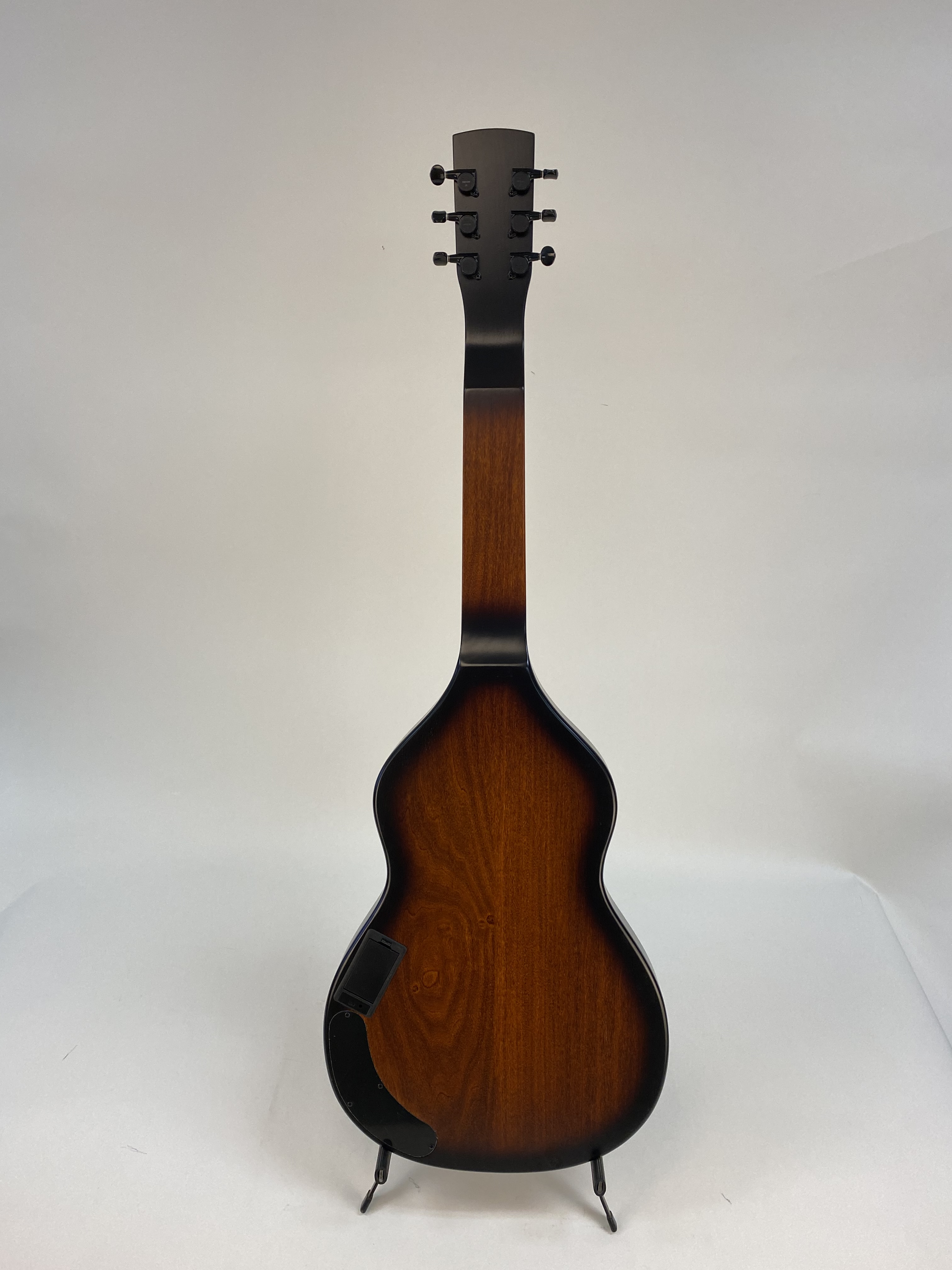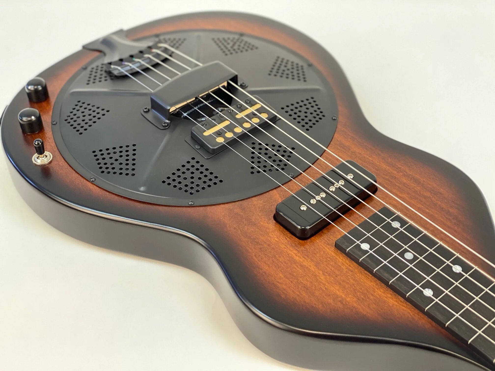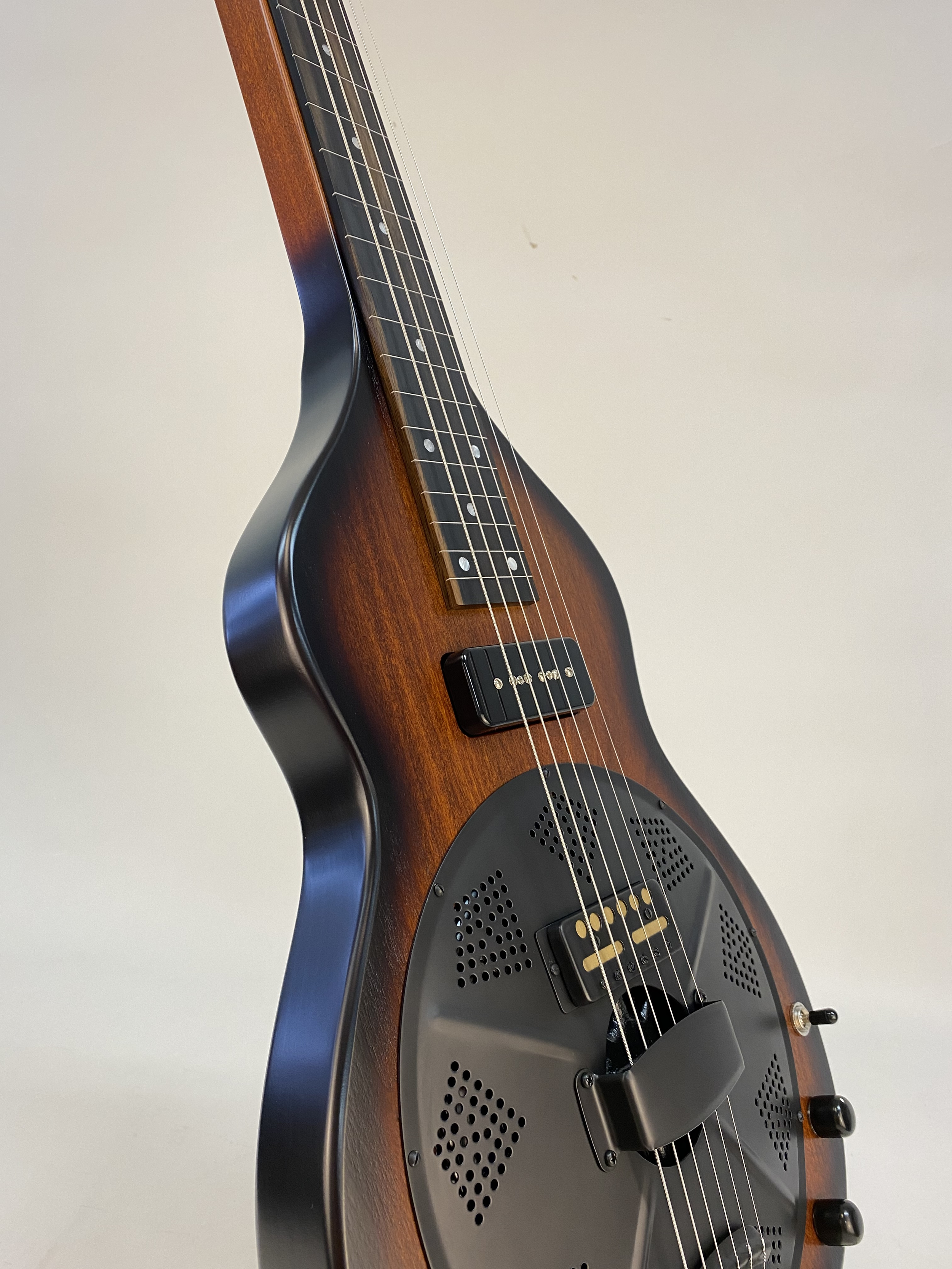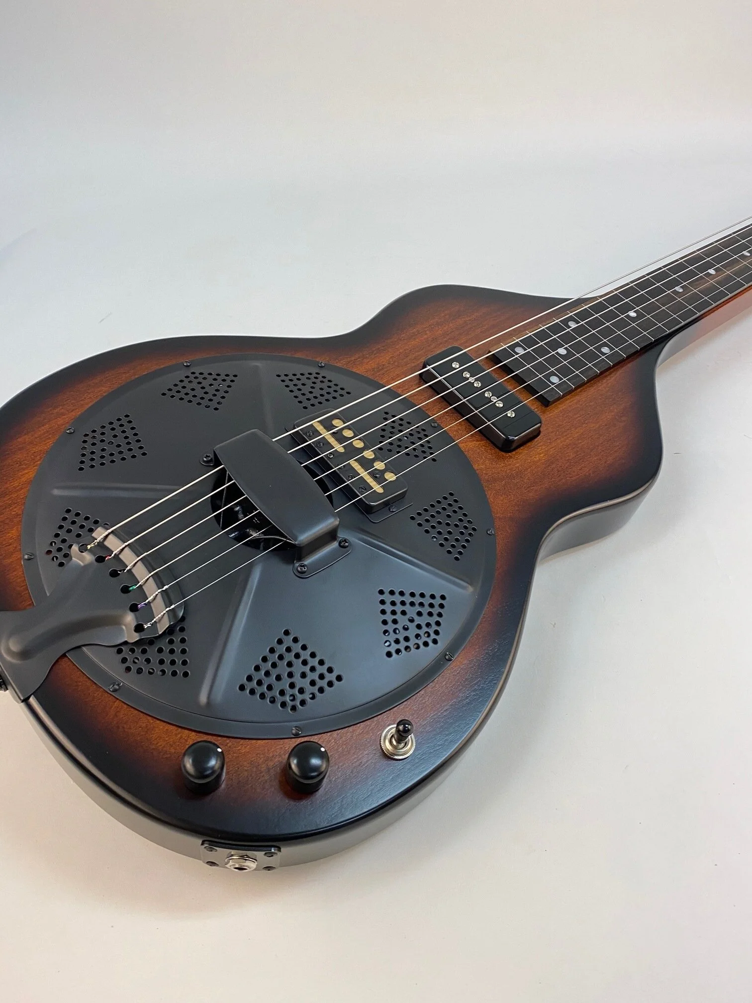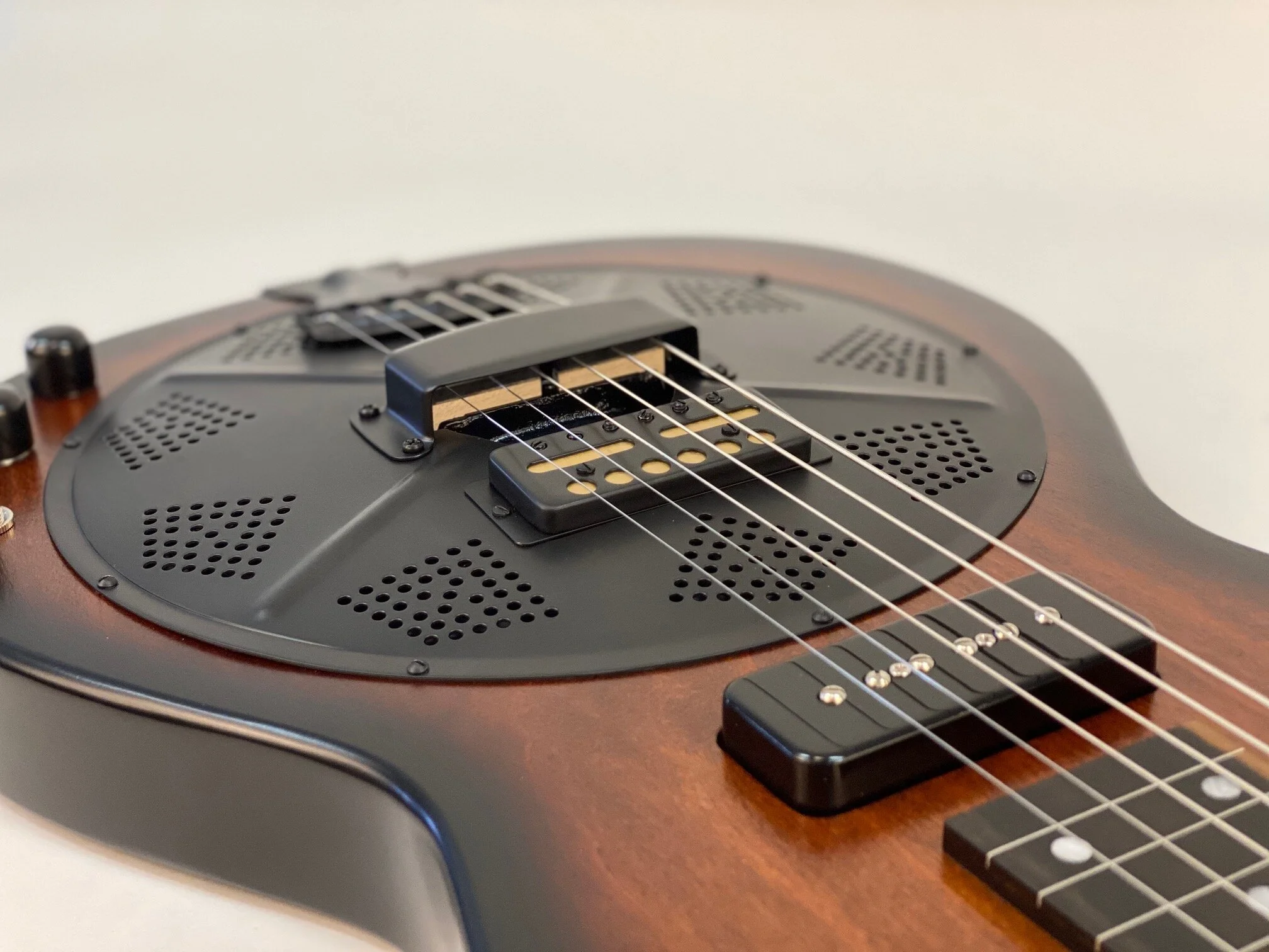 The Beard Road-O-Phonic™ is a compact acoustic/electric instrument for the musician who wants a lot of punch and versatility in a small package. With three distinct pickups, the Fishman Nashville bridge pick up, a cover plate mounted Lollar gold foil, and a Lollar P-90 in the neck position, this instrument can produce an infinite variety of sounds. The Fishman powered preamp allows you to play in a standard mono configuration or to split the Fishman bridge and magnetic pickups into stereo. This allows the player to emulate the range of sounds from a rich, mellow laptop steel guitar to a screaming bluesy resonant slide guitar or a combination of both. Solid poplar construction, dot inlay with ebony fretboard. Beard® hand spun BC-9 spider bridge resonator. Tobacco Burst satin finish.