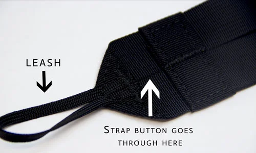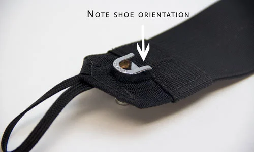 6) Pull knob and slide Straplock shoe over the strap button. It should click when seated properly. Note: Again, do not use leash with Straplocks.